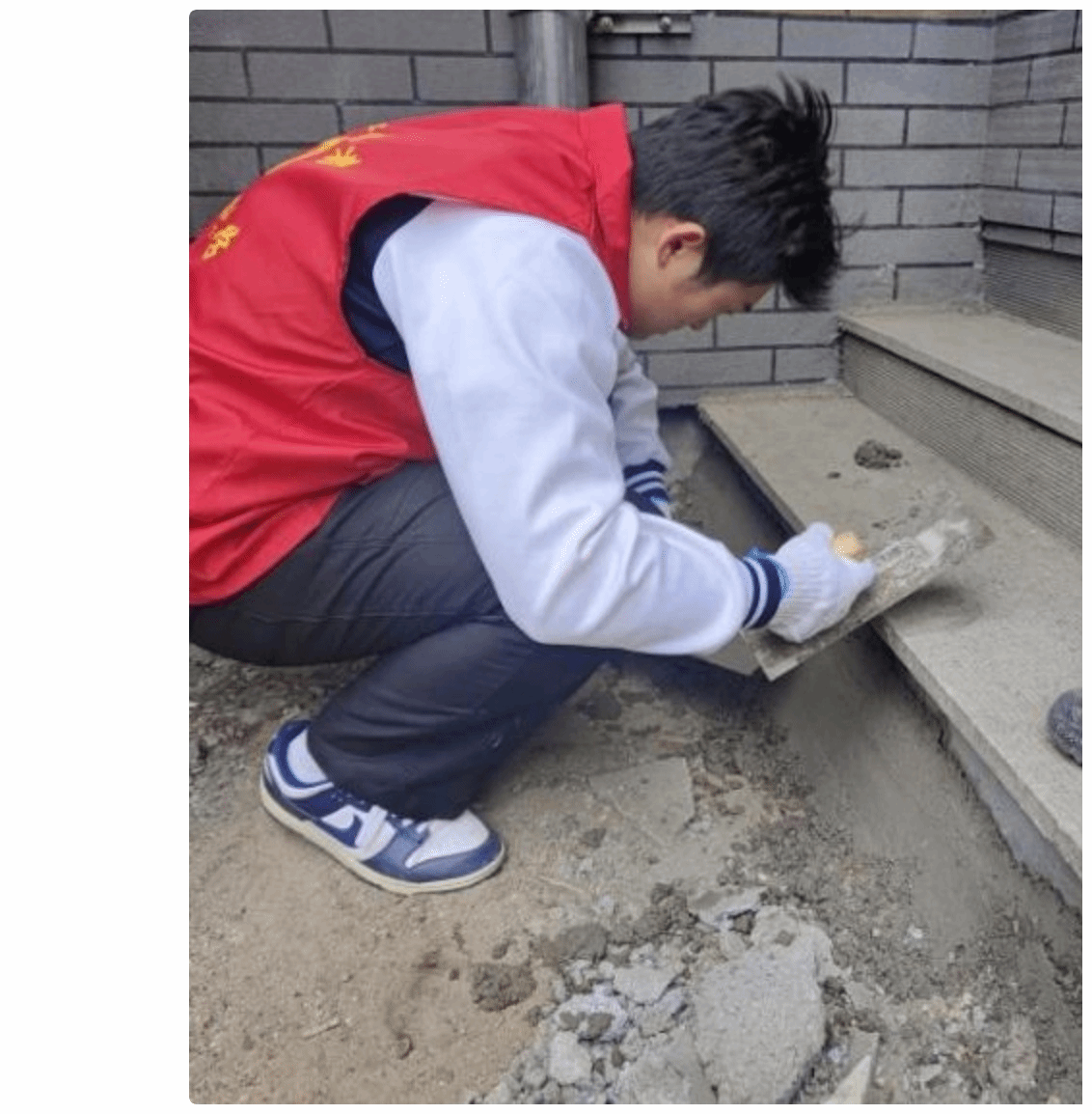 活动中,志愿者们积极发扬不怕苦、不怕累的劳动精神,积极学习工作人员演示的如何高效地抹水泥,并现场实践。志愿者们经过一段时间的操作,从刚开始的生疏到后来的熟练运用抹刀,用不到一个上午的时间便将宿舍楼下多个空缺的位置填补完整。修缮后的成果得到了工作人员们的一致好评。