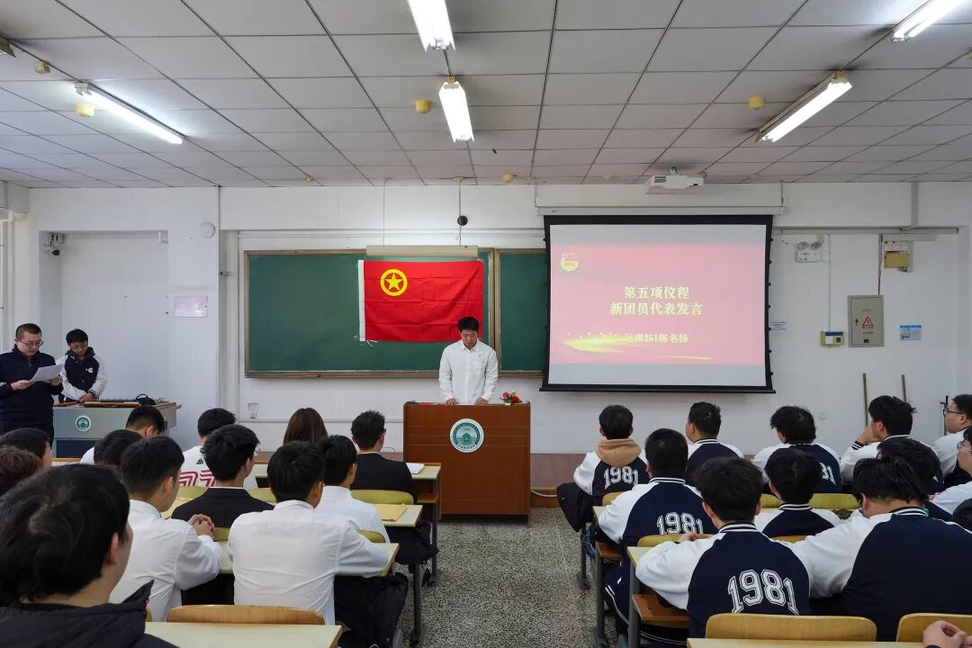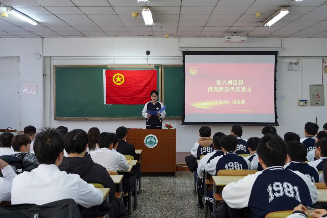仪式上,建筑工程学院输电241班杨逸菲同学代表优秀团员发言,建议新团员主动关注国家发展、契合时代需求,将个人成长与集体发展相结合,牢记团员职责、认真履职尽责,以务实行动践行团员使命。体育学院新团员代表运训251陈名扬则结合“更高、更快、更强”的体育精神,表达了将个人拼搏与强国梦想紧密结合,在赛场上和生活中都争做先锋的决心。