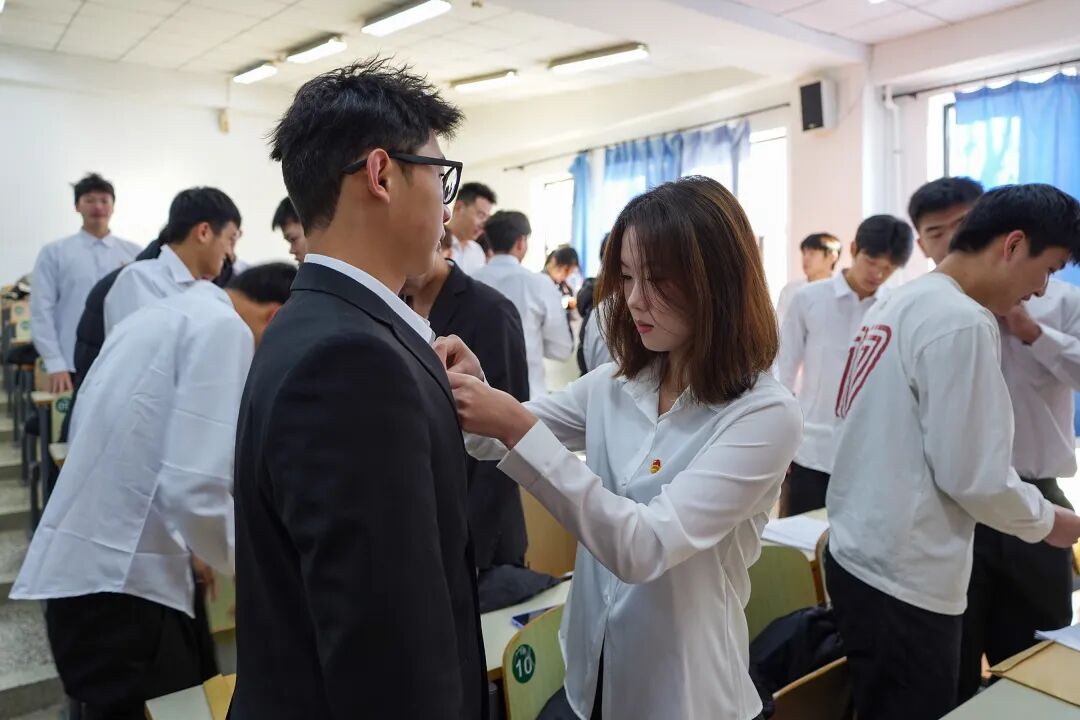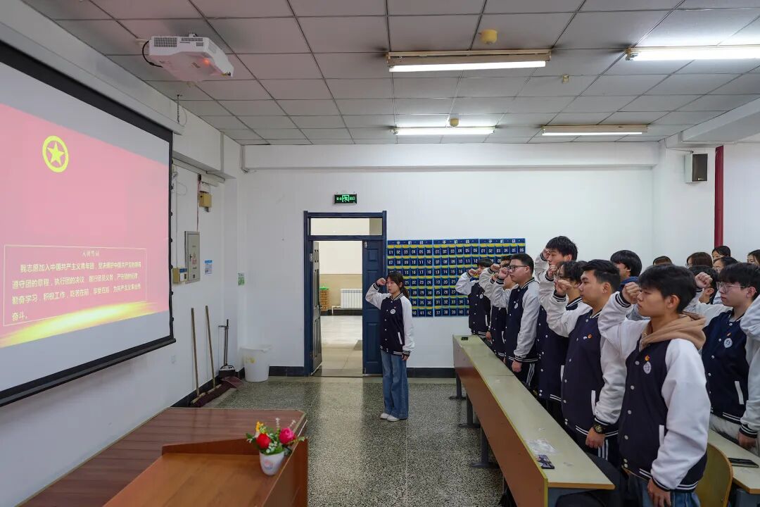 在鲜艳的团旗见证下,新团员们高举右拳,以最洪亮的声音庄严宣誓,铿锵有力的誓言回荡在会场,彰显了他们将誓言内化于心、外化于行的坚定决心。紧接着,新团员佩戴上闪亮的团徽。这枚徽章不仅象征着团员身份,更意味着一份沉甸甸的责任与担当。