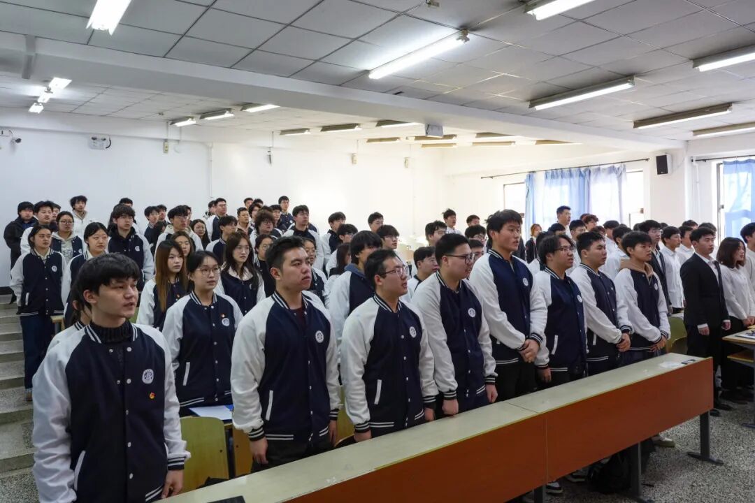 仪式在激昂的中华人民共和国国歌声中拉开序幕。全场与会者肃立,齐声高唱,展现了新时代青年昂扬的精神风貌。随后,肖建磊老师郑重宣读了新团员名单,92名经过严格培养与考察的优秀青年被正式接纳加入中国共产主义青年团。