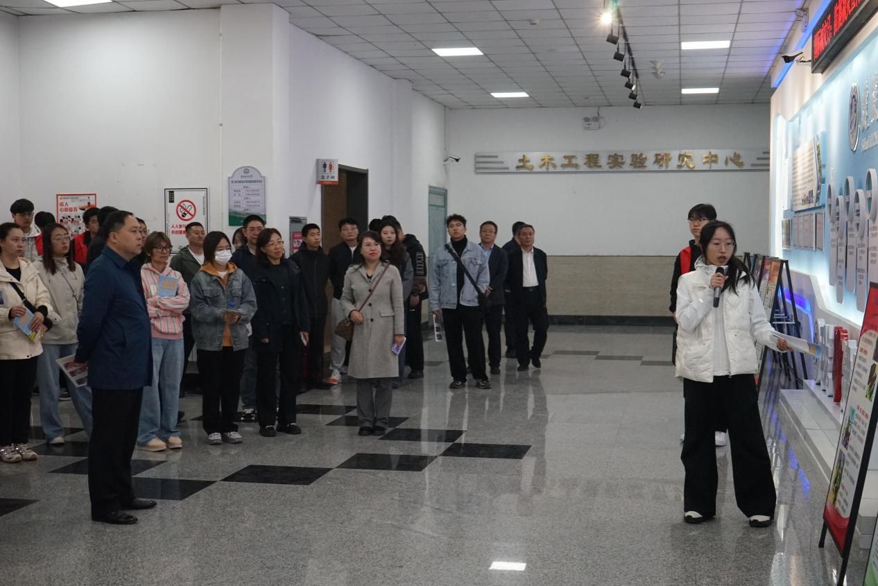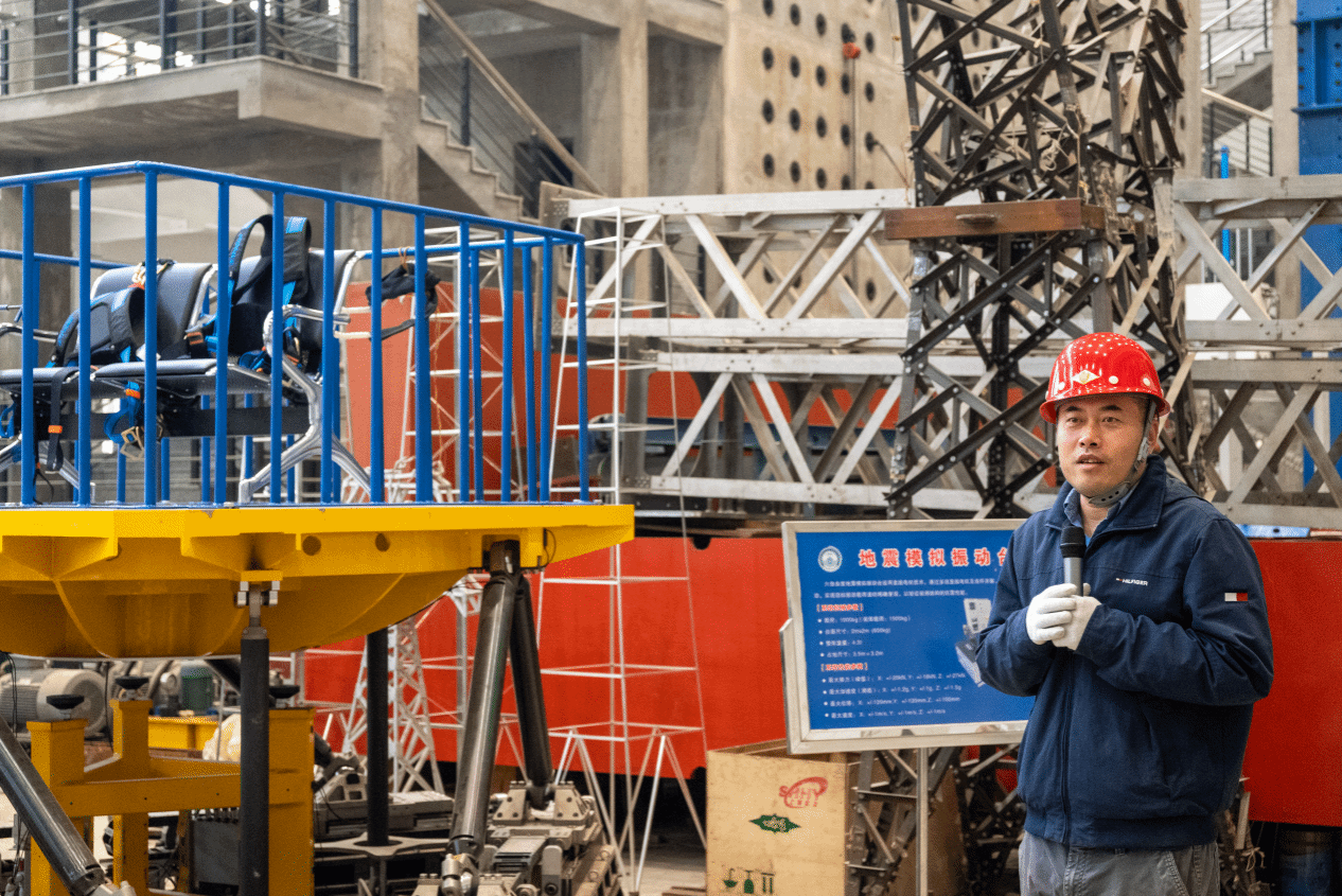在土木工程实验中心结构大厅,一行人通过地震模拟振动实验台,感受地震的震动强度,实践“伏地、遮挡、手抓牢”等地震避险技巧。